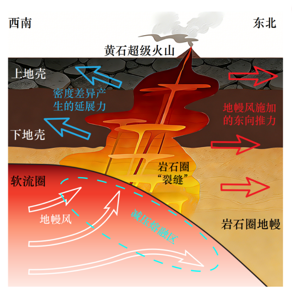 黄石超级火山下方岩浆生成与运移过程和岩石圈“裂缝”成因示意图。(作者供图)