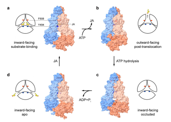 该研究揭示了AtABCG16特异识别并跨膜转运茉莉酸的分子机理,解释了AtABCG16在转运底物上的争议,并丰富了ABC转运蛋白的跨膜转运机制。