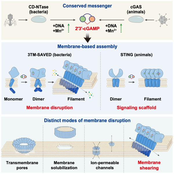 这项研究从信号分子、受体机制和效应执行三个层面,拓展了学界对天然免疫进化多样性的理解,揭示了2'3'-cGAMP在原核生物中的保守生成机制,阐明了其特异性驱动跨膜效应蛋白变构与高阶装配的过程,为理解天然免疫信号体系演化多样性和膜蛋白破坏生物膜机制提供了新视角。