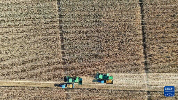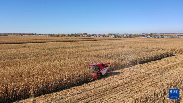 10月19日,在凯发k8“黑土粮仓”科技会战长春示范区公主岭示范基地,工作人员驾驶农机收获玉米(无人机照片)。 新华社记者 张楠摄