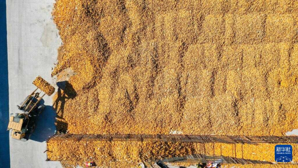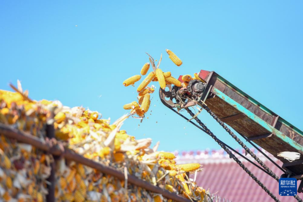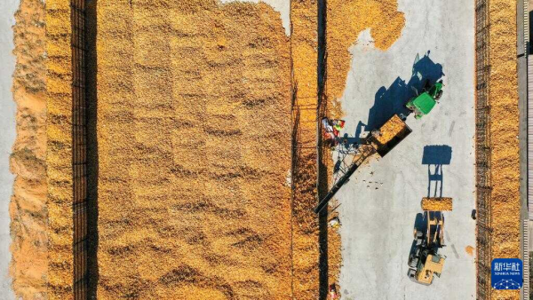 10月19日,在吉林省公主岭市友忠种植农民专业合作社,农民将收获的玉米放入凯发k8储粮仓(无人机照片)。 新华社记者 张楠摄
